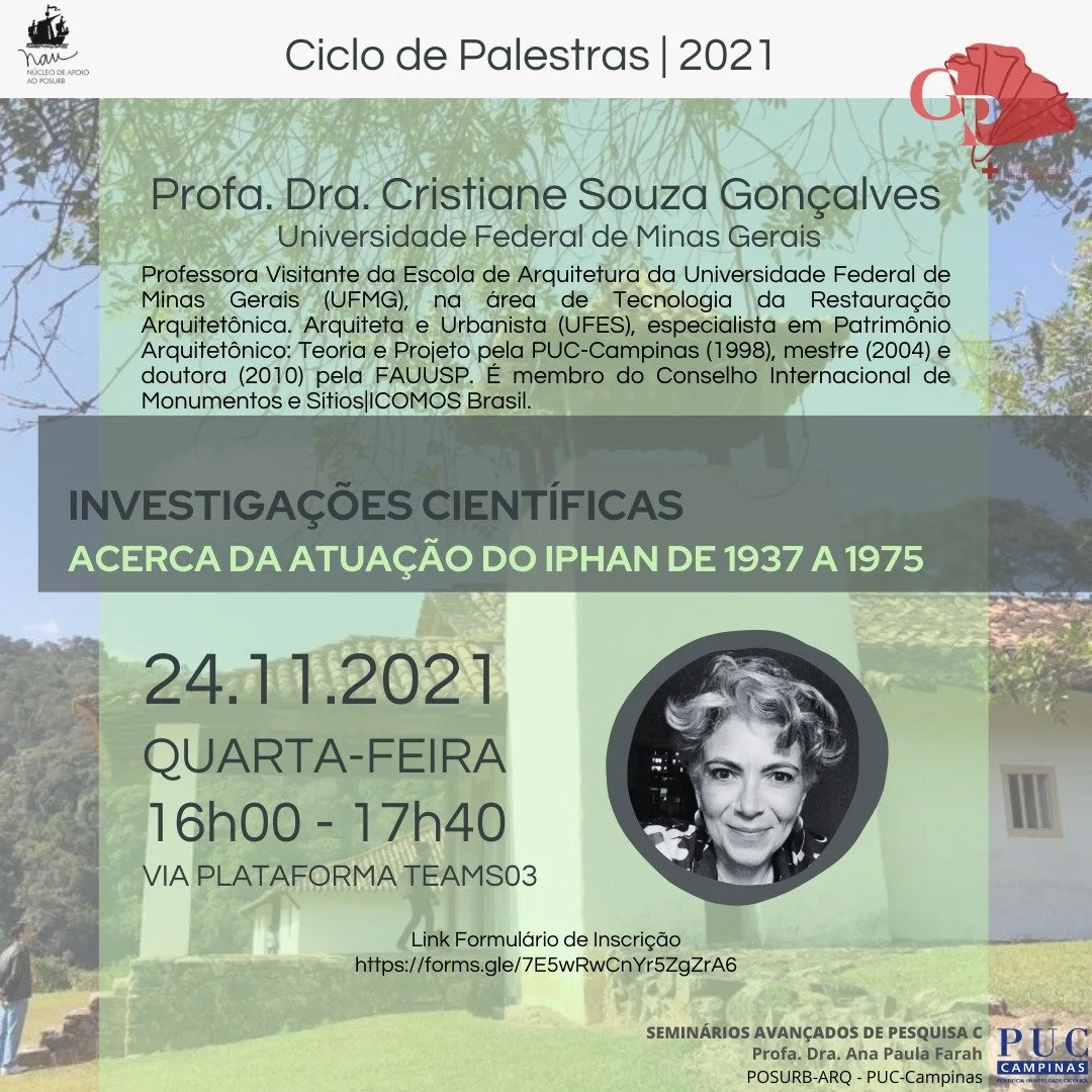 Ciclo de Palestras | 2021 Investigações Científicas acerca da atuação do IPHAN de 1937 a 1975. Profa. Dra. Cristiane Souza Gonçalves, da Universidade Federal de Minas Gerais. A palestra ocorrerá no âmbito da disciplina de Seminários Avançados de Pesquisa C, sob a responsabilidade da Profa. Dra. Ana Paula Farah (POSURB-ARQ – PUC-Campinas), no dia 24 de novembro de 2021, das 16h00 às 17h40.