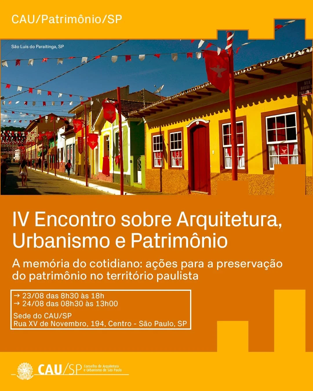 Nos dias 23 e 24 de agosto, o CAU/SP realiza o IV Encontro sobre Arquitetura, Urbanismo e Patrimônio Cultural 🏘.