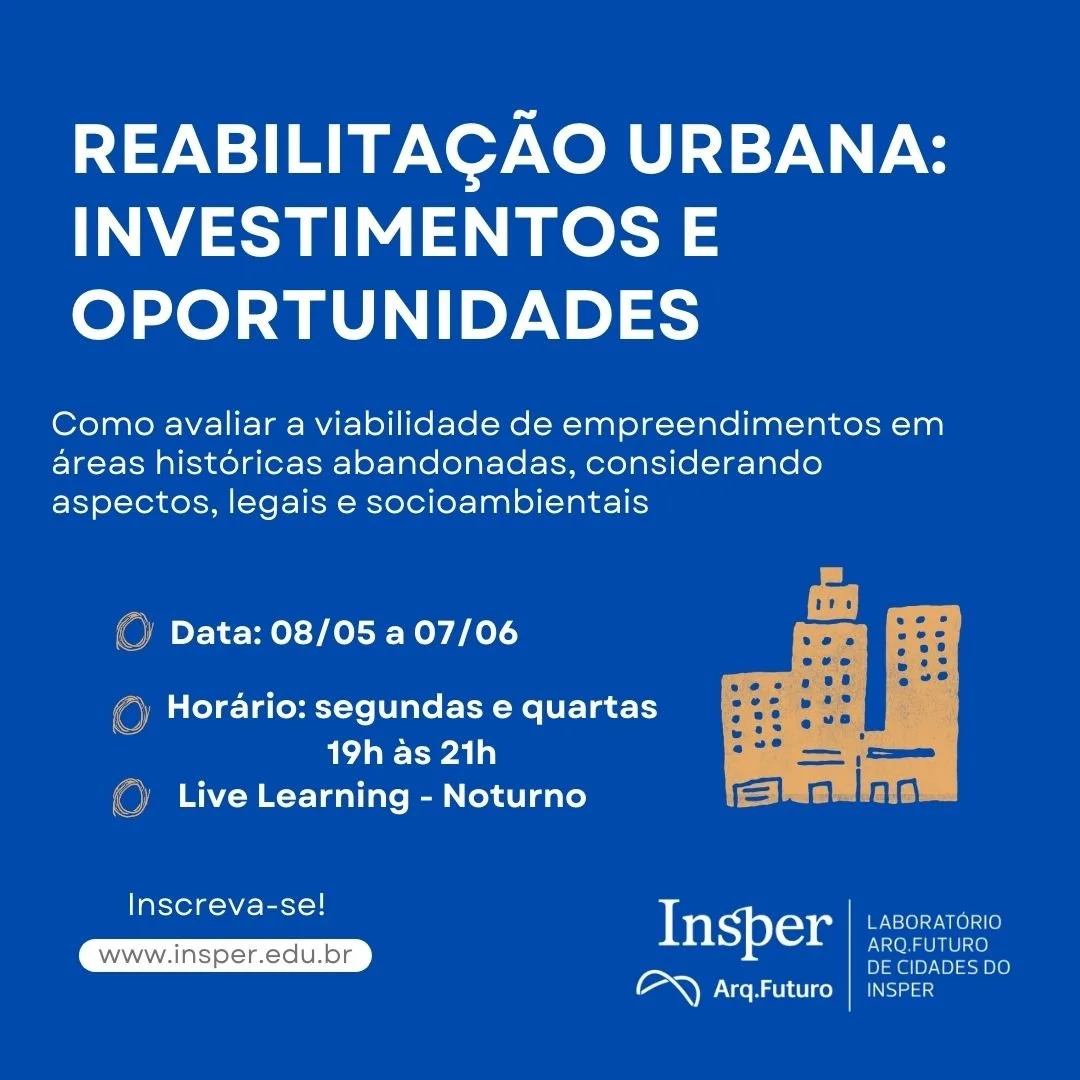 O curso destina-se a compreender, a partir de um panorama histórico, aspectos fundamentais do processo de reabilitação urbana, desde as questões econômicas, jurídicas, socioambientais e arquitetônicas, tomando como base estudos de caso que permitam uma aproximação metodológica segura na definição da viabilidade de empreendimentos que possam determinar uma nova qualidade para o ambiente da cidade.